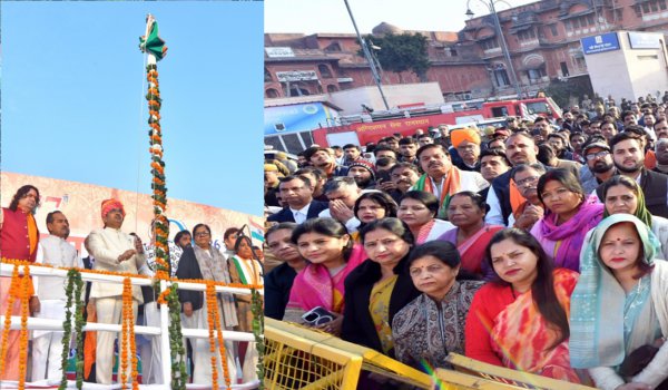 जयपुर। राजस्थान के मुख्यमंत्री भजनलाल शर्मा ने सोमवार को गणतंत्र दिवस के उपलक्ष्य में राजधानी जयपुर में बड़ी चौपड़ पर राष्ट्रीय ध्वज तिरंगा फहराया और कहा कि यह दिन महान स्वतंत्रता सेनानियों के त्याग, तपस्या और बलिदान का प्रतीक है।
