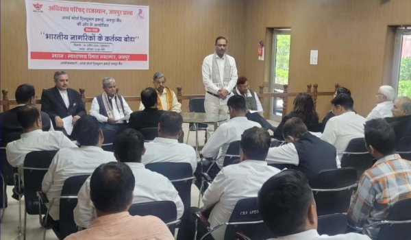 जयपुर। अधिवक्ता परिषद राजस्थान जयपुर प्रांत की आर्म्ड फोर्सेज ट्रिब्यूनल (AFT) इकाई जयपुर बैंच की ओर से भारतीय नागरिकों के कर्तव्य बोध विषय पर प्रेरणादायक विचार गोष्ठी का आयोजन किया गया। इस अवसर पर समाज में नैतिक मूल्यों और राष्ट्रप्रेम की अलख जगाने वाले पंच परिवर्तन के महत्व पर विस्तृत प्रकाश डाला गया।