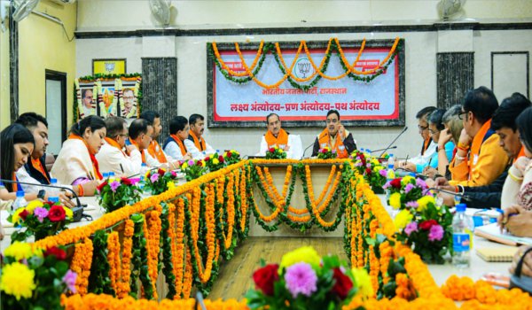 बैठक की अध्यक्षता भाजपा प्रदेश अध्यक्ष मदन राठौड़ ने की। बैठक में नवनियुक्त पदाधिकारियों का परिचय, संगठन की मजबूती तथा सरकार की लोक कल्याणकारी योजनाओं को जन-जन तक पहुंचाने की रणनीति पर विस्तृत चर्चा हुई। राठौड़ ने पदाधिकारियों को संबोधित करते हुए कहा कि शर्मा के नेतृत्व में प्रदेश सरकार जन हितैषी और लोक कल्याणकारी नीतियों पर उत्कृष्ट कार्य कर रही है। सरकार किसानों, महिलाओं, युवाओं सहित समाज के हर वर्ग के लिए नई योजनाएं शुरू कर रही है। बेरोजगार युवाओं को रोजगार उपलब्ध कराने, राइजिंग राजस्थान आयोजित करने तथा नई नीतियों के क्रियान्वयन पर तेज़ी से कार्य हो रहा है।