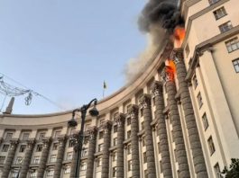 रूस के हमलों के बाद यूक्रेन की सरकारी इमारत में लगी...