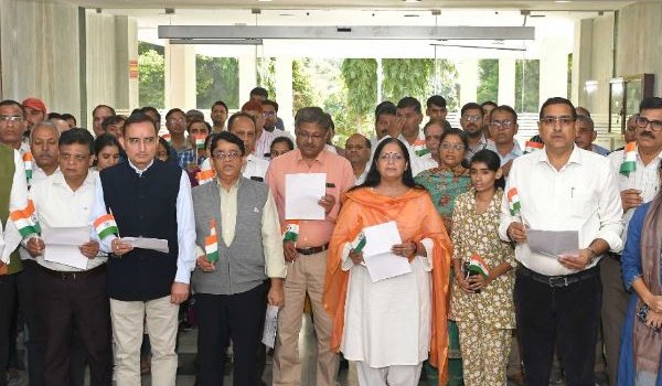 आवासन भवन का प्रत्येक कोना तिरंगे की आभा और राष्ट्रभक्ति के उल्लास से ओतप्रोत दिखाई दिया। उपस्थित अधिकारी-कर्मचारियों ने राष्ट्रगीत के माध्यम से स्वतंत्रता संग्राम के अमर सेनानियों, मां भारती के सपूतों और स्वदेशी आंदोलन के प्रेरणास्रोतों को नमन किया।