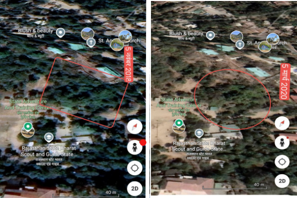 माउंट आबू ईको सेंसेटिव जोन में स्काउट ग्राउंड के पास की जमीन पर 2018 और 2020 की सेटेलाइट इमेजमें नजर आती हरियाली