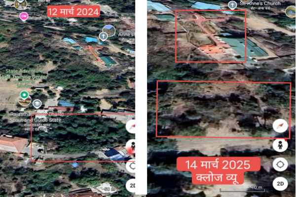 माउंट आबू में स्काउट गाइड ग्राउंड पास की भूमि की 2024 को सेटेलाइट तस्वीरें में दिखते पेड़ और 2025 की सेटेलाइट तस्वीर में दिखती चट्टानें।