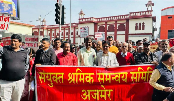 संयुक्त श्रमिक समन्वय समिति के आव्हान पर अजमेर की 18 यूनियनों ने संगठित रूप से देश व्यापी एक दिवसीय हड़ताल को नैतिक समर्थन प्रदान करते हुए रेलवे स्टेशन से मदार गेट, गांधी भवन, कचहरी रोड होते हुए कलेक्ट्रेट तक रैली निकाली। रैली में कर्मचारी नए श्रम कानून रद्द करों, निजीकरण बन्द करों, आउट सोर्सिंग बन्द करों, श्रमिक अधिकारों की रक्षा करो, महिलाओं के अधिकारों की रक्षा करो, कार्य के 8 घण्टे सीमित करो, सामाजिक सुरक्षा सुनिश्चित करो के नारे लगाए।