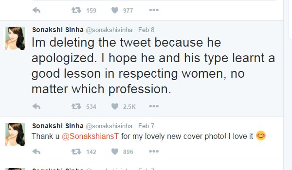 इस बातचीत का स्क्रीनशॉट सोनाक्षी ने ट्विटर पर पोस्ट किए। हालांकि, बाद में सोनाक्षी ने ट्विटर पर लिखा कि वह ट्वीट डिलीट कर रही हैं क्योंकि उस शख्स ने माफी मांग ली है।