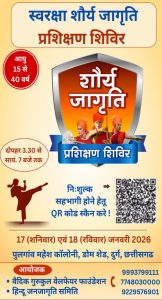 दुर्ग। समाज में बढ़ती असुरक्षा, आपराधिक प्रवृत्तियां, सड़कों पर छेड़छाड़, गुंडागर्दी, साइबर उत्पीड़न जैसी घटनाओं के कारण आज युवक-युवतियों एवं महिलाओं की सुरक्षा एक गंभीर चुनौती बन गई है। प्रत्येक युवा आत्मविश्वासी, सक्षम और स्वावलंबी बने—इसी उद्देश्य को लेकर वैदिक गुरुकुल वेलफेयर फाउंडेशन एवं हिंदू जनजागृति समिति के संयुक्त तत्वावधान में 17 से 18 जनवरी को दोपहर 3.30 बजे से शाम 7 बजे तक डोम शेड महेश कॉलोनी पुलगांव दुर्ग में निःशुल्क शौर्य जागृति प्रशिक्षण शिविर का आयोजन किया जाएगा।