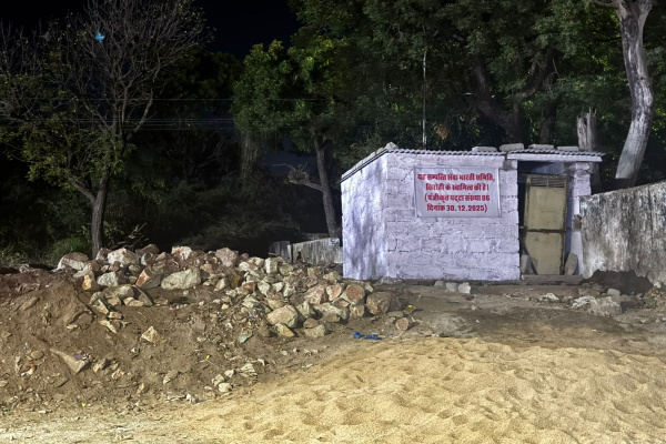 सिरोही में राजस्व विभाग द्वार पैमाईश की है भूमि पर रातों रात बनाई गई कोठरी और उस पर लगाया बैनर।