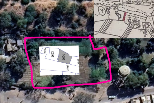 सिरोही मने खसरा संख्या 2694 का गूगल मापी, राजस्व मैप और पैमाईश में लाल रंग से चिन्हित भूमि का मैप।