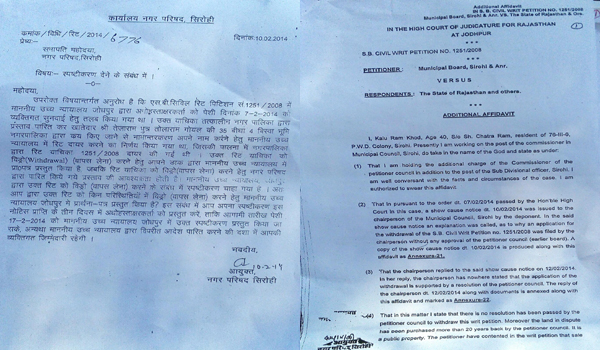 सभापति महेन्द्र मेवाडा ने बताया कि हाल ही में वीसी के माध्यम से सुप्रीम कोर्ट में राजीव नगर आवासीय योजना के केश की पेशी थीं। सुनवाई के दौरान ये तथ्य सामने आया कि सिरोही नगर परिषद ने इस केस को वापस लेने के लिए सुप्रीम कोर्ट में अर्जी दाखिल की है। पूछने पर पता चला कि ये अर्जी आयुक्त ने दाखिल की हैं। सिरोही नगर परिषद के दस्तावेज खंगालने पर पता चला कि राजीव नगर आवासीय योजना के ब्याज पेटे 20 नवम्बर 2023 को जमा करवाए गए 22 लाख 62 हजार रुपये के चेक के जमा होने के दिन बाद 29 नवम्बर को आउटवर्ड नम्बर 5787 से ये पत्र जारी किया गया था।इस पत्र की कार्यालय प्रति और इससे संबंधित पत्रावली नगर परिषद से नदारद बताई जा रही है। सभापति ने इस मामले में सुप्रीम कोर्ट में अधिवक्ता को पत्र लिखकर आयुक्त द्वारा लिखे गए पत्र पर बोर्ड की असहमति होने का पत्र भेजा।