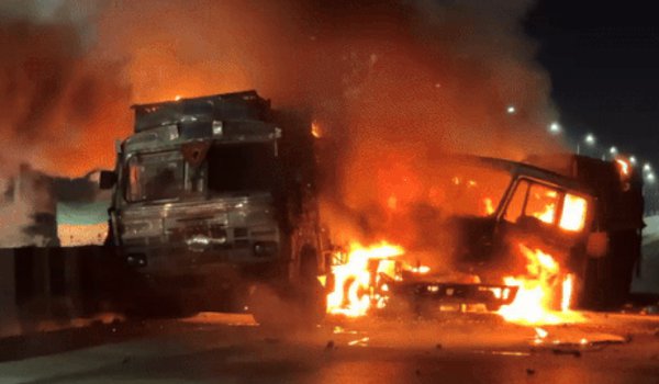 पुलिस सूत्रोंं ने बुधवार को बताया कि गंगरार स्थित राष्ट्रीय राजमार्ग पर भीलवाड़ा की ओर जा रहे प्याज से भरे ट्रक का टायर फट गया, इससे वह अनियंत्रित हो गया। उसी दौरान पीछे से आ रहे ट्रेलर उससे टकरा गया। टक्कर होते ही दोनों वाहनों में आग लग गई।