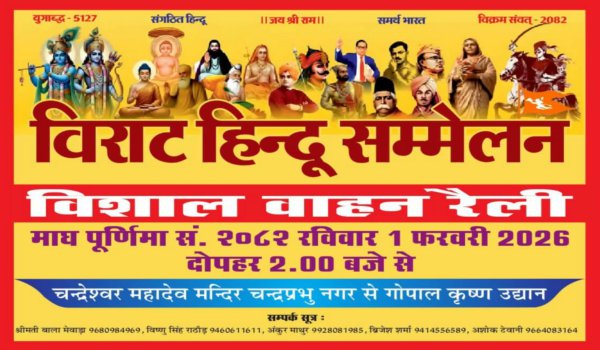 आयोजन समिति के अशोक टेवानी ने बताया कि सम्मेलन से पूर्व विशालल वाहन रैली निकाली जाएगी। यह रैली दोपहर 2 बजे चन्द्रेश्वर महादेव मंदिर चंद्रप्रभु नगर से आरंभ होकर भैरूवाडा, गणेश गुवाडी होते हुए हिन्दू सम्मेलन स्थल गोपाल कृष्ण उद्यान पहुंचेगी। रैली में केसरिया दुपट्टा और केसरिया साफा पहने युवा आकर्षण का केन्द्र रहेंगे।